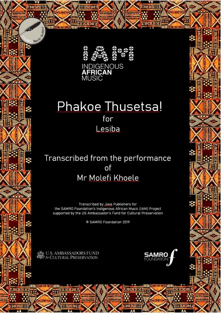 “Phakoe is a Sotho word for a Hawk. Thusetsa means help us. During harvest time there are usually a lot of locusts and other insects that come around in the fields, the people perform this song to plead with the hawk to come and help with the insects. The Hawk plays the role of a repellent for the insect. In Lesotho the work has many different versions; all Lesiba players are expected to know how to play the song as it is a measure for how good a player is.” (Mpho Molikeng, 2019)